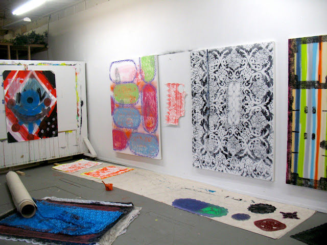 Tamara collects the lace, which she uses as a stencil, from various thrift stores and dollar stores. We discussed the effect that the woven pieces that are made by hand have on her. She talked about how they hold the vibrations of a human's touch and how she liked to think about their makers and the making process. Tamara's paintings, with their heavy saturation of hues and jutting bars of light, are reminiscent of the phantasmagoric qualities of a festival. On one piece of canvas she is able to capture the energy and vivacity of any given number of religious or cultural celebrations, be it a parade or spiritual ceremony. Tamara told me about her multiple trips to Mexico in the 90's during the Day of the Dead and, later, her time spent in India at the Sanskriti Kendra artist residency in 2002. It is obvious how heavily her travels have impacted her work. Her description, particularly of the churches in Mexico, with their elaborate colonial architecture mimicking the Baroque Cathedrals of Spain and altars filled with collections of contemporary objects and grotesque renditions of the Crucifixion, was so vividly narrated I could almost close my eyes and see it. You could see this just as easily in the work.