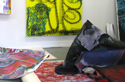 Tamara had hung a photocopy of an Egyptian figure next to the sculpture above. She explained to me that she had been holding onto this image for a long time, later discovering its relationship to the piece she is currently working on. I love how the studio can hold the artist's secrets. Tamara's three dimensional works have the same celebratory and mystical quality as her paintings, as well as the many installation pieces she has also done. She showed me how at one point she was putting various objects right on her canvas. I thought of it as a way of humanizing these abstract works, like giving a gift to the painting, or making the painting an altar within itself.